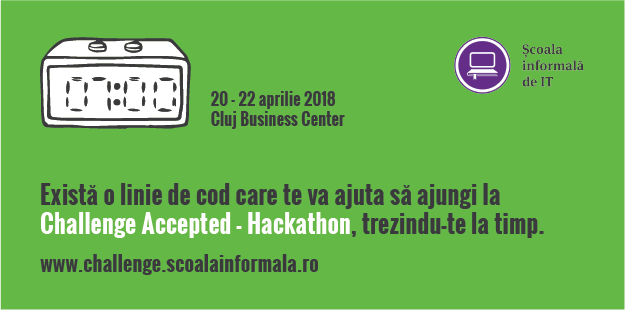 Challenge Accepted - Hackathon are loc în 20 - 21 - 22 aprilie, la Cluj Business Center. Evenimentul este susținut și de mentorii și comunitatea de alumni de la Școala Informală de IT.