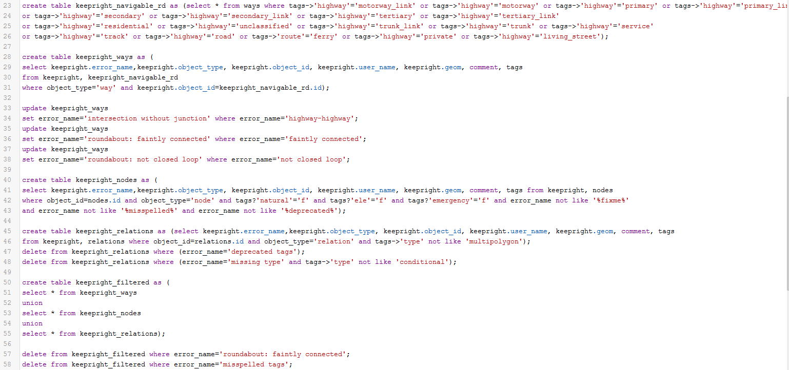 Etapele de lucru includ atât căutarea erorilor în aplicaţia online (Fig.1) cât şi identificarea acestora în fişierul .txt descărcat din aplicaţie. În acest fişier, erorile pot fi organizate pe utilizatori şi regiuni. Primul pas presupune descărcarea fişierului https://keepright.at/keepright_errors.txt.bz2, după care urmează importarea acestuia în PostGIS într-o bază de date ce conţine informaţii spațiale, unde va fi filtrat folosind o serie de interogări.