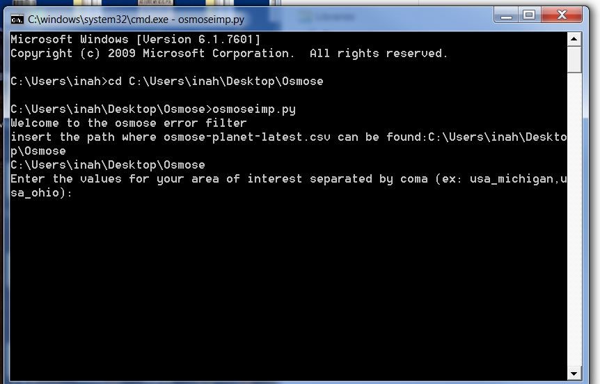 Pentru a începe filtrarea erorilor din Osmose descărcăm prima data fișierul de erori din site-ul oficial: http://osmose.openstreetmap.fr/export/. Îl dezarhivăm şi folosind scriptul osmoseimp.py, alegem zona pe care dorim să o corectăm (Fig.5).