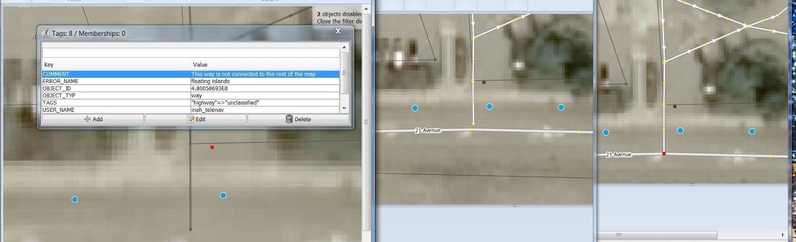 Un alt exemplu de eroare este "floating islands", care afișează way-urile care nu sunt conectate sau nu sunt accesibile. În Figura 6 este prezentat un exemplu de astfel de eroare și modul în care este corectată.