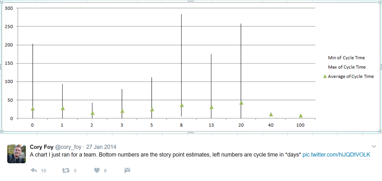 Un exemplu extrem de relevant este cel postat pe Twitter de Cory Foy în 2014 (Figura 1). El prezintă situația acurateței estimărilor folosind puncte (0, 1, 2, 3, 5, 8, 13 sau 20 bazate pe șirul Fibonacci) realizate de una dintre echipele coordonate de el și arată că pentru oricare dintre estimări există diferențe relevante în ceea ce privește durata de execuție a user story-urilor. Pe de altă parte, calculând media timpului necesar de implementare a user story-urilor ce aveau asignate același număr de puncte a constatat că acesta nu variază foarte mult în raport cu complexitatea estimată. Concluzia sa a fost că, dacă s-ar fi considerat această medie pentru măsurarea velocității și planificarea proiectului, rezultatul ar fi fost mult mai aproape de realitate decât utilizarea punctelor rezultate în urma estimării.
