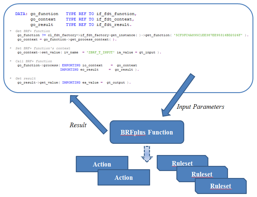 Obiectul central (core) ce va face legătura între aplicația BRFplus și aplicațiile cu care clienții trebuie să se integreze este funcția BRFplus. Funcția va defini scopul aplicației prin intermediul semnăturii funcției. Aceasta include: tipul datelor de intrare, rezultatul și modul în care datele sunt procesate conform regulilor definite. Există trei moduri diferite de a procesa funcția, ceea ce va influența complexitatea funcției. Putem opta pentru abordarea de sus în jos (top-down), utilă pentru cazurile simple de business, abordarea numită și Functional Mode (Mod Funcțional), sau putem opta pentru mai multă complexitate prin intermediul Event Mode (Mod Eveniment) unde putem implementa diferite seturi de reguli. A treia abordare este o combinare a primelor două moduri.