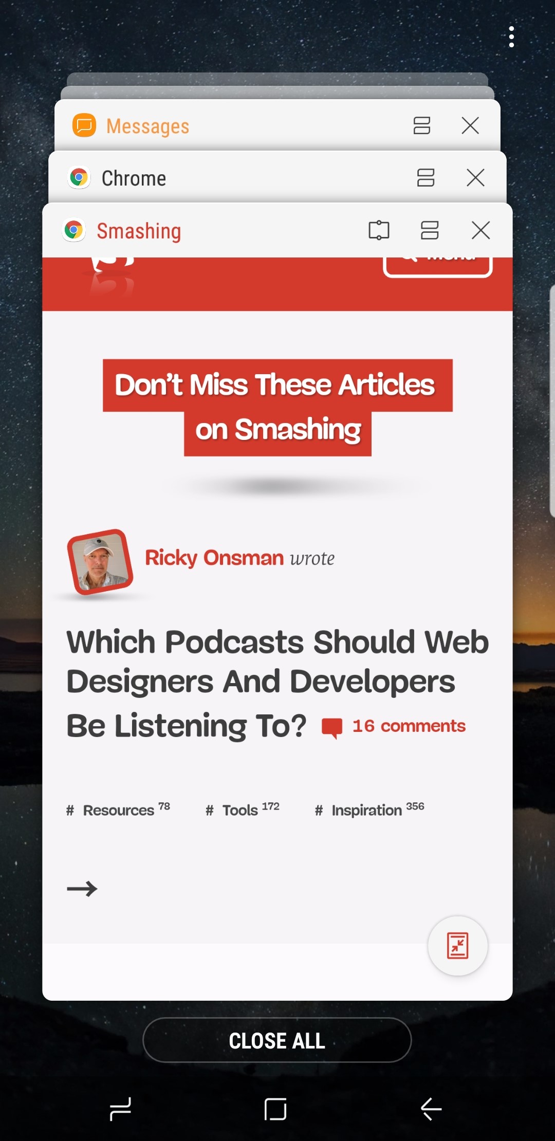 În timp ce începea să-și amintească vag o parte din aceste lucruri - menționate în acel articol inițial de relansare a versiunii mobile - deschide pe telefonul său ecranul în care poate naviga printre aplicațiile active sub forma unei liste de ferestre. Aici observă că într-adevăr, site-ul web al publicației sale preferate este acum o aplicație, așezată din coincidență chiar lângă fereastra aplicației de browser de internet. Copiii cresc atât de repede, se gândește browserul.