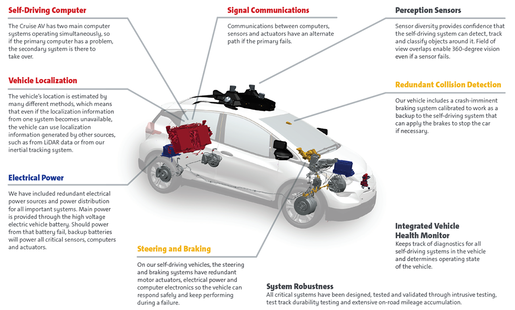 Ținând cont de cele menționate mai sus, vom adresa două întrebări: "Cum se comportă vehiculul în cazul în care o componentă sau sistem întâmpină probleme sau funcționează defectuos?" și "Chiar dacă acesta funcționează în parametri normali cum se comportă în condițiile de trafic și condițiile meteorologice extreme?" În raportul lor de siguranță și securitate, GM explică în detaliu cât de riguroase sunt analizate riscurile, prin studiul caracteristicilor principale de siguranță, din multiple și diferitele unghiuri, precum și utilizarea unei game largi de "instrumente de testare potrivite" pentru a rezolva orice problemă care ar putea apărea. Mergând și mai departe, autovehiculul poate funcționa corect chiar dacă există o defecțiune într-un sistem fragilizat, prin redundanța încorporată în computerele autovehiculului, rețelele, actuatorii și controlorii acestora.