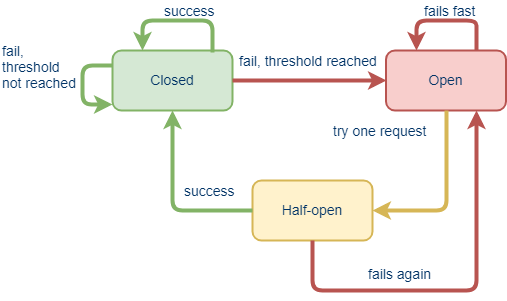 Deschis -- starea în care circuit breakerul va trece imediat ce s-a depășit numărul maxim admis de requesturi eșuate. Orice request ulterior va fi respins, întorcându-se fie un fallback, fie o eroare.