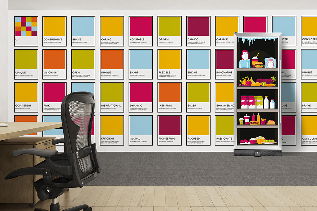 La nivel intern, pentru noile lor birouri, ne-am inspirat din culorile şi valorile expuse în manualul lor de brand pentru a da culoare spaţiului, în adevăratul sens al cuvântului. Fiecare element a fost creat cu grijă pentru a se integra în poveste.