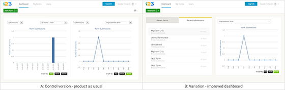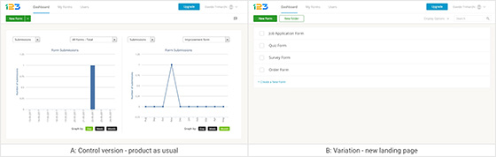 Ipoteza: Am crezut că pagina de pornire a editorului, un dashboard ce arată toate formularele unui utilizator, nu îi încuraja pe utilizatori să interacționeze cu formularele lor sau să creeze noi obiecte. Am decis să testăm dashboardul curent și o pagină de pornire unde utilizatorii puteau vedea doar o listă a formularelor lor. Ne-am așteptat ca noul design să îi determine pe utilizatori să creeze mai multe obiecte și să interacționeze cu cele curente.
