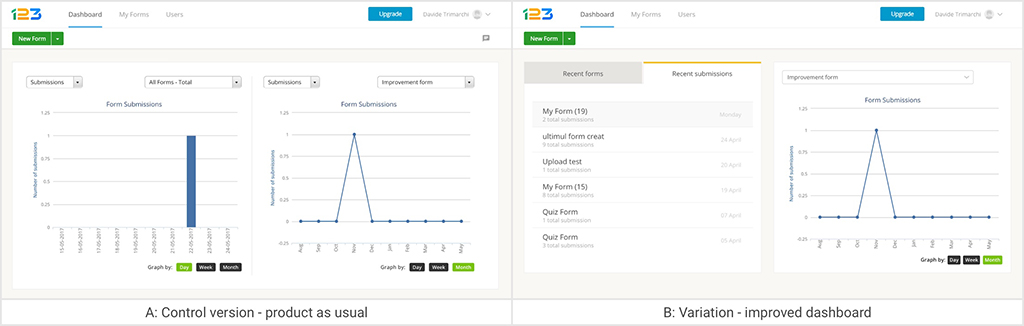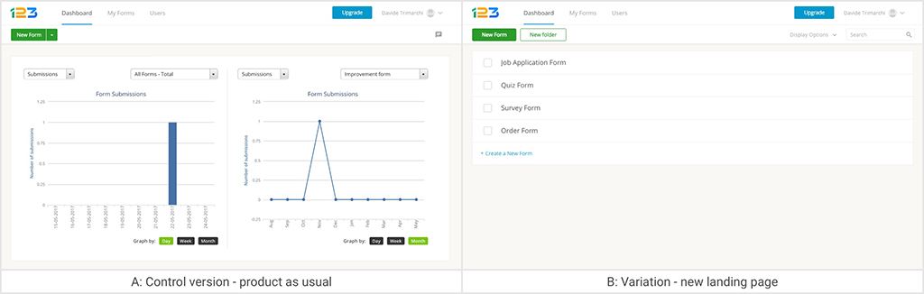 Pentru a învăța mai multe despre modul în care funcționează testarea A/B, să analizăm două teste recente A/B care au avut drept obiect dashboardul editorului nostru de formulare: unul a avut succes, celălalt nu.