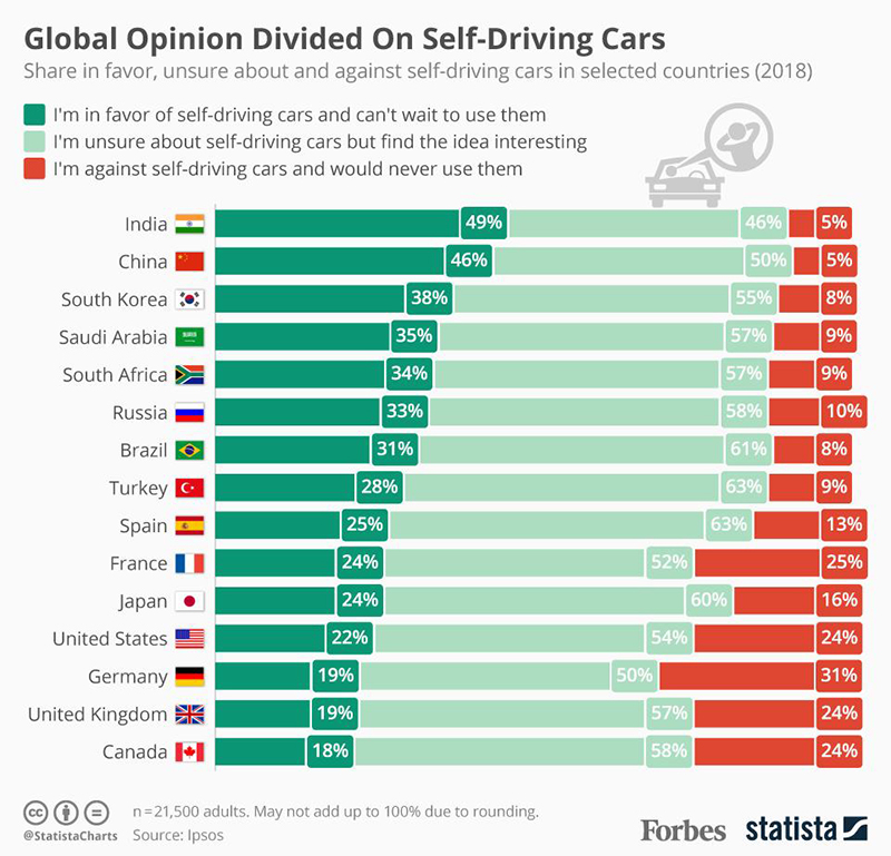 Scopul final al introducerii conducerii autonome este reducerea numărului de accidente și asigurarea unui confort sporit pe perioada călătoriei. Cu toate acestea, conform unui studiu publicat de Forbes, dorința de a folosi automobile autonome este destul de scăzută în țări precum SUA, Germania, Marea Britanie și foarte ridicată în China sau India. Așadar, există riscul ca nu toată lumea să fie fericită atunci când le vor vedea circulând pe străzi.