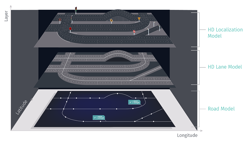 Modelul de localizare HD - Conține detalierea obiectelor de pe traseu dar și date pentru o localizare exactă a mașinii. Pentru a putea fi folosită, precizia localizării în acest domeniu trebuie să aibă o marjă de eroare de maxim câțiva centimetri.