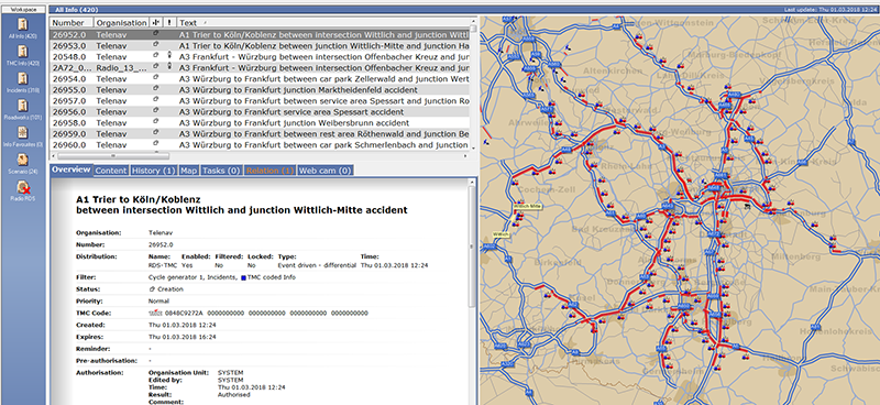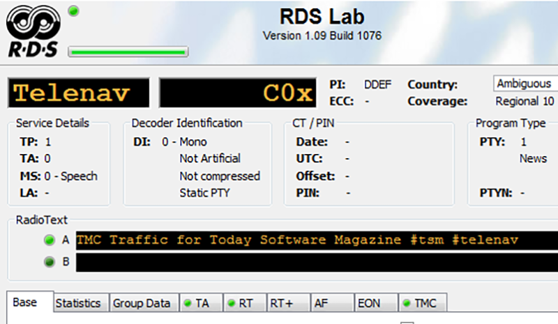 Evenimentele TMC generate de către noi vor apărea ca fiind transmise de către o staţie TMC din Germania. În imaginea alăturată este statia radio Telenav FM -> rack cu encoder, decoder, transmiţător, switch, antenă şi laptopul care controlează echipamentele: