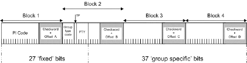 Fiecare grup e reprezentat prin 4 blocuri de 16 biți, din care primii 27 sunt 'ficşi' şi apar în fiecare grup RDS, ei conţinând informaţiile importante ale unui canal radio (PI, PTY, TP) şi group-type indicator (codul grupului transmis). Cei 37 de biți rămaşi conţin informații specifice fiecărui grup. În fiecare minut se transmit aproximativ 685 de grupuri RDS(11.4 grupuri/sec.).