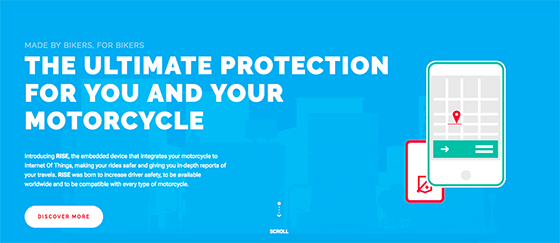RiSE este un sistem high-tech, pentru motocicliști, care se integrează fără probleme cu orice motocicletă, detectează accidente, trimite informații de salvare și date medicale. RISE vă face motocicleta mai inteligentă, folosind tehnologii pentru a vă urmări performanțele în timpul călătoriei și a vă supraveghea motocicleta în timpul parcării.