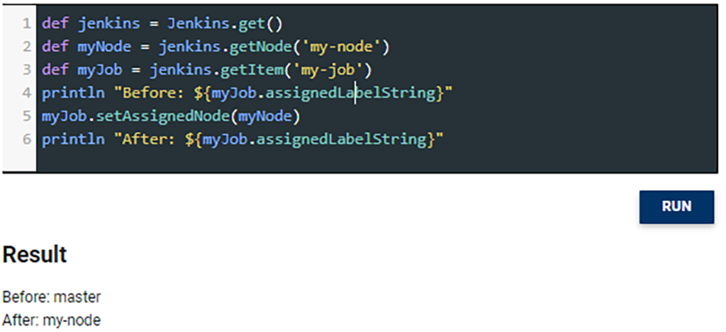 "Puterea" secretă a pluginurilor de Jenkins provine din faptul că ele (fiind rulate în același JVM) pot să referențieze obiectele specifice de Jenkins. Jenkins oferă un API bogat și simplu către pluginuri pentru manipularea joburilor, viewurilor, node-urilor și a setărilor. Elementul central al acestui API este clasa jenkins.model.Jenkins. Ca să avem o idee despre cum arată această manipulare, putem să folosim Script Console pentru rularea scripturilor de Jenkins. Această consolă suportă scripturi Groovy (și implicit Java). Fig. 1 exemplifică desemnarea unui node la un job printr-un script de Groovy. Această consolă este foarte utilă pentru a testa codul nostru fără să facem deploy la pluginul dezvoltat de noi, însă nu are suport de auto-completare, este recomandată foloirea ei împreună cu un IDE.