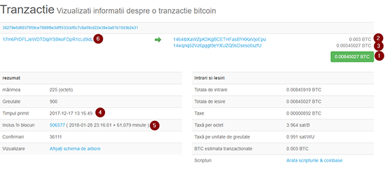 Pe data de 17 decembrie 2017, adresa noastră a înregistrat (4) 0.0084 bitcoin (1), ceea ce înseamnă aproximativ 8 miimi de bitcoin, ceea ce, pentru o medie de 1 bitcoin = 10000 dolari americani, duce la aproximativ 84 de dolari americani. Am trimis către prima adresă de intrare (2 - cea care începe cu 146...), 0.003 bitcoin, adică aproximativ 30 de dolari. Am mai trimis către a doua adresă de ieșire (cea care începe cu 14w...) restul sumei, adică 0.0054 bitcoin. Ca să fim sinceri, aplicația "e-wallet" (portofel electronic) pe care o folosim, adică aplicația mobilă Mycelium, a creat complet automat a doua adresă de ieșire (3), deci aceasta ne aparține! Am fi putut transfera restul sumei rămase (0.0054 BTC) înapoi către adresa originală (6), dar aplicația Mycelium a fost configurată pentru a crea automat o nouă adresă pentru fiecare rest rezultat din tranzacție, pentru a-i deruta pe intrușii care vor să urmărească circulația banilor.