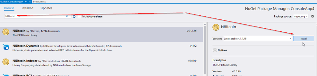 Prin intermediul Nuget Package Manager, vom mai adăuga două librării externe de care vor depinde exemplele noastre: NBitcoin și QBitNinja.Client.