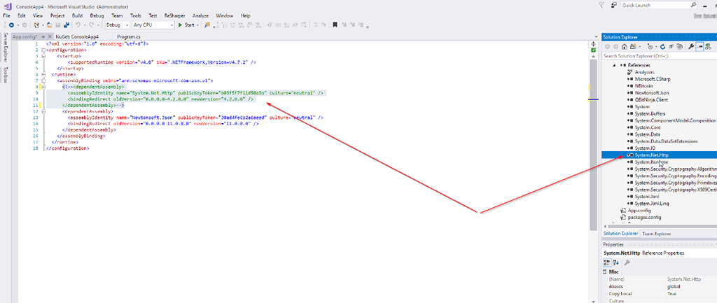 În .Net 4.7.x întâlnim o eroare frecventă la runtime, în ceea ce privește librăria System.Net.Http. Problema poate fi rezolvată comentând secțiunea corespunzătoare configurației app.config și îndepărtând manual, din referințele proiectului, secțiunea ce se referă la System.Net.Http.