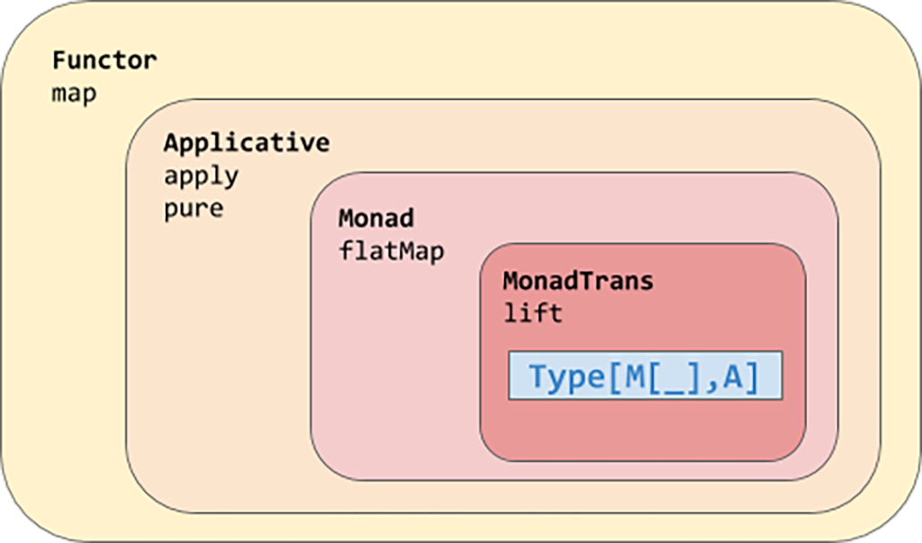 S-ar putea considera, practic vorbind, că un monad transformer este doar un wrapper peste tipurile de genul F[G[A]], unde F și G sunt monade, în primul exemplu F[Either[A, B]] devine EitherT[F, A, B]. Din convenție, un monad transformer se termină cu litera mare T. Așa se diferențiază varianta monad transformer a unei monade. De exemplu, Either și EitherT, State și StateT etc.
