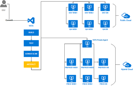 Am reușit cu ajutorul lui Visual Studio Team Services să implementăm o soluție de Continuous Delivery prin intermediul unui Self Hosted Agent care orchestrează livrarea artefactului între un Cloud Public - Microsoft Azure și un Cloud Hibrid care se află în spatele unui firewall și cu internet printr-un proxy server. Soluția este una fiabilă deoarece nu se modifică structura artefactului.