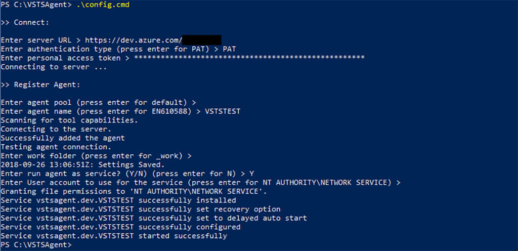 Authentication Type- Se va specifică metoda de autentificare între Self Hosted Agent și instanța de VSTS. Implicit ceea mai bună opțiune este PAT sau Personal Access Token care se generează de către un administrator al instanței de VSTS.