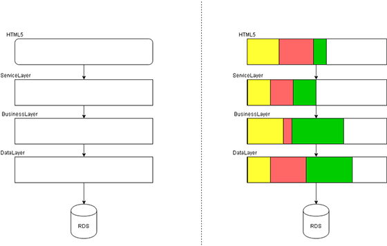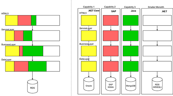 În imaginea de mai sus, pe partea dreaptă, se observă cum toate nivelele au acum un "slice" vertical, bazat pe capabilităţi specifice (reprezentate în diferite culori: fiecare culoare reprezintă o capabilitate), ce pot fi transformate în noi aplicaţii, rezultând noi microservicii. Fiecare capabilitate poate avea amprente diferite pe fiecare nivel. De aceea, efortul de a extrage o anume capabilitate diferă în funcţie de impactul pe care îl are asupra monolitului.