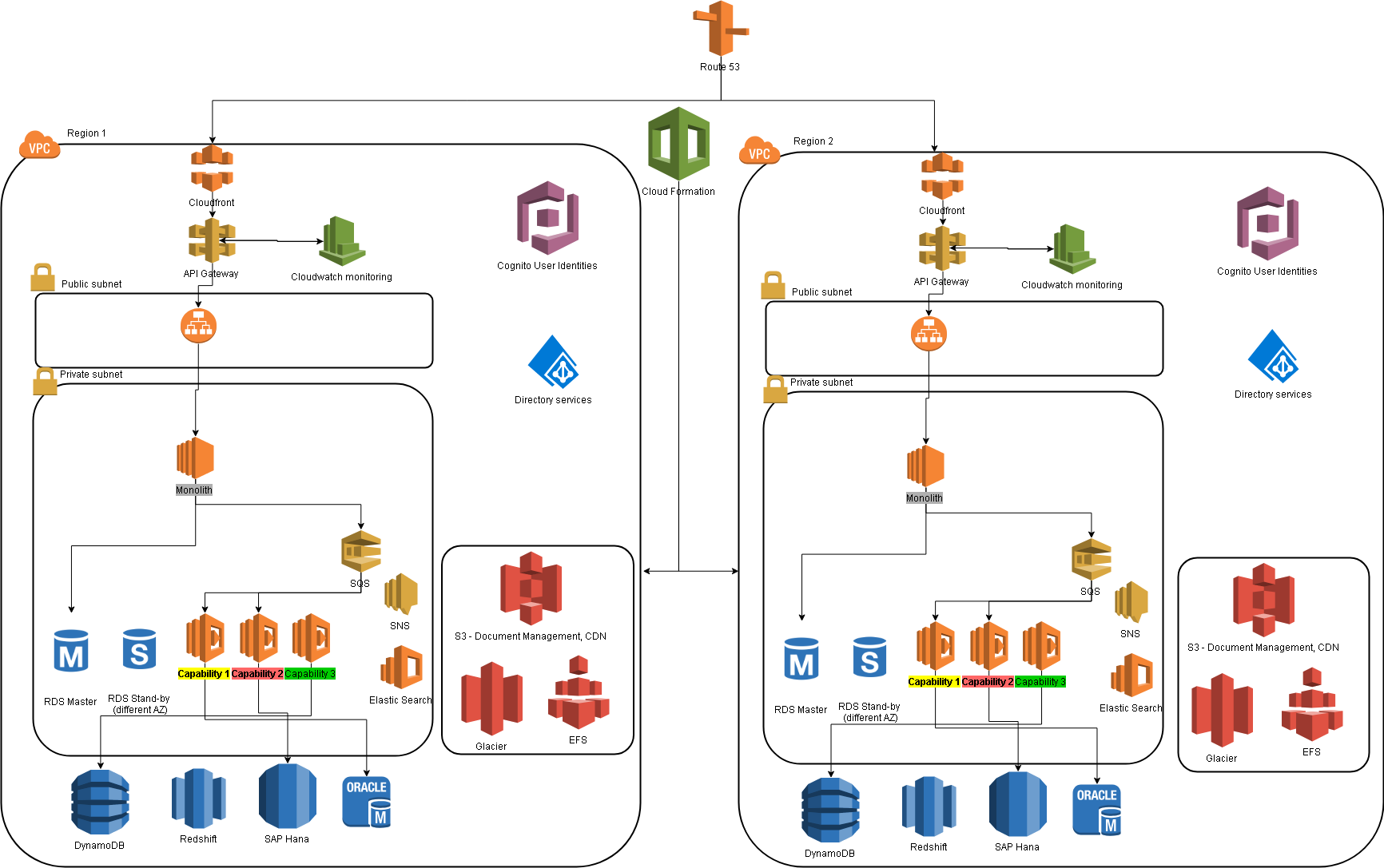 Mai jos, este un exemplu de deployment a trei noi capabilităţi (reprezentate în diferite culori - în secțiunea de private subnet) ce au fost extrase din monolit, împreună cu aplicaţia monolit.