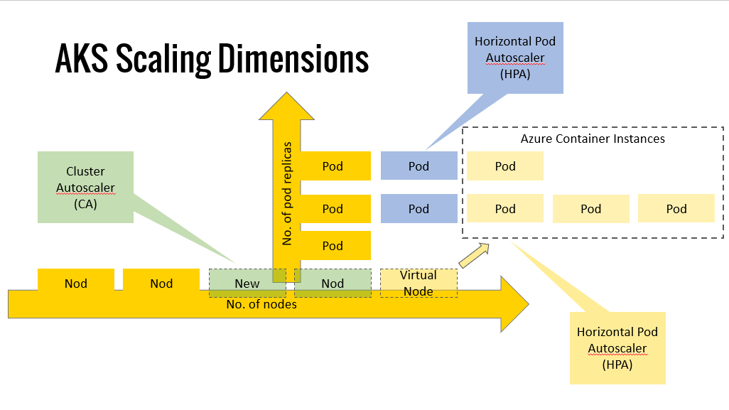Când discutăm despre scalarea automată în interiorul AKS, trebuie să ținem cont că în interiorul AKS avem posibilitatea să scalăm în mod automat în două direcții. Una din ele este controlată de către Kubernetes și se referă la numărul de replici pentru fiecare pod sau serviciu. A doua dimensiune este legată de dimensiunea clusterului, unde AKS ne oferă posibilitatea să creștem sau să scadem dinamic numărului de noduri în funcție de diferiți parametri.