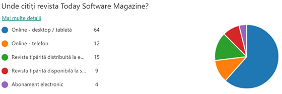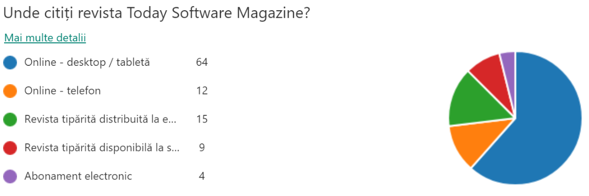Numărul celor care au răspuns chestionarului a fost 104 de persoane dintre care 98 au fost interesate de citirea revistei în format PDF. Ne bucurăm de acest interes, care valorifică și un preț avantajos. Mai multe detalii la secțiunea abonamente de pe www.todaysoftmag.ro.