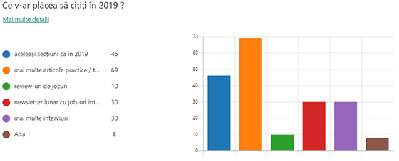 În asociere cu întrebarea anterioară, pentru 2019, vom încerca să avem mai multe articole practice și vom continua bineînțeles cu secțiunile existente. Review-urile de jocuri se pare că nu a generat o explozie de răspunsuri pozitive, cum unii s-ar fi așteptat. În schimb, aproape o treime dintre răspunsuri au inclus adăugarea unui newsletter de joburi și mai multe interviuri, direcții pe care le luăm în considerare în 2019.