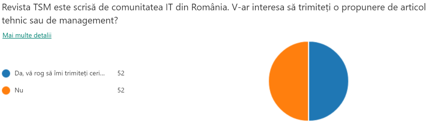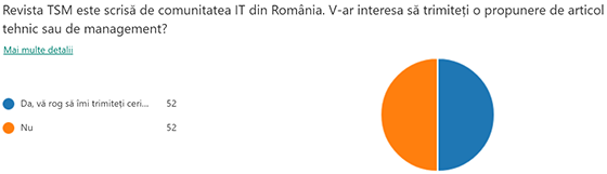La început de 2019, ne-am decis să cerem părerea voastră, a cititorilor, despre activitatea revistei. Răspunsurile primite ne-au confirmat direcția TSM în ceea ce privește conținutul revistei și dorința de implicare a cititorilor inclusiv în realizarea articolelor. Drept dovadă, jumătate dintre cei care au răspuns și-au manifestat intenția de a putea publica la rândul lor, un articol tehnic sau de management