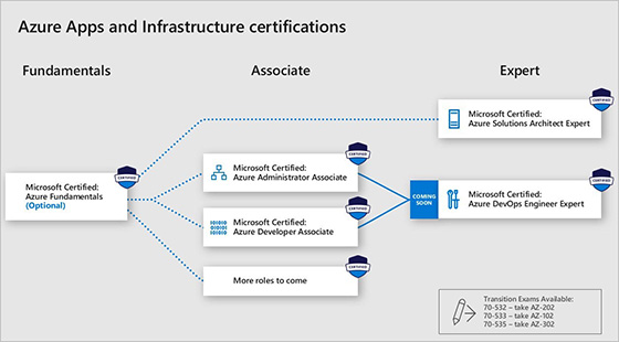 Noile trasee de certificare asociate pe job-roles, disponibile în acest moment sunt următoarele: Microsoft Certified Azure Fundamentals, Azure Administrator, Azure Developer, Azure Solutions Architect, Azure DevOps Engineer și Microsoft 365 Certified Security Administrator Associate, Modern Desktop Administrator, Enterprise Administrator.