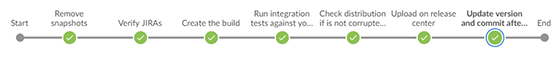 Fiecare stage poate fi configurat după necesitați. În cazul nostru, fiecare stage are responsabilitatea de a activa un jenkins job, de a procesa răspunsul acestuia și de a decide următoarele acțiuni pe baza răspunsului primit. Aceasta abordare ne dă posibilitatea să ne definim checkpoints per stage. Beneficiul acestor checkpoints este faptul că dă posibilitatea utilizatorului să interacționeze cu pipeline-ul în cazul unor situații excepționale (ex. Probleme de infrastructură sau hardware). În cazul unei intervenții manuale, utilizatorul are opțiunea de a reîncerca un anumit pas. De asemenea, poate ignora acel pas sau poate să oprească tot procesul de livrare. Aceste acțiuni pot varia în funcție de implementare.
