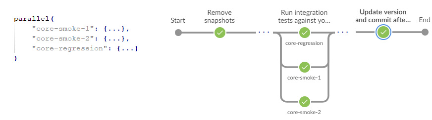 De asemenea, jenkins pipeline ne permite rularea în paralel a anumitor pași. Această capabilitate este utilă mai ales în cadrul produselor care au mai multe suite de teste de integrare. Toate aceste teste pot fi rulate în paralel, astfel se salvează timp în procesul de livrare.
