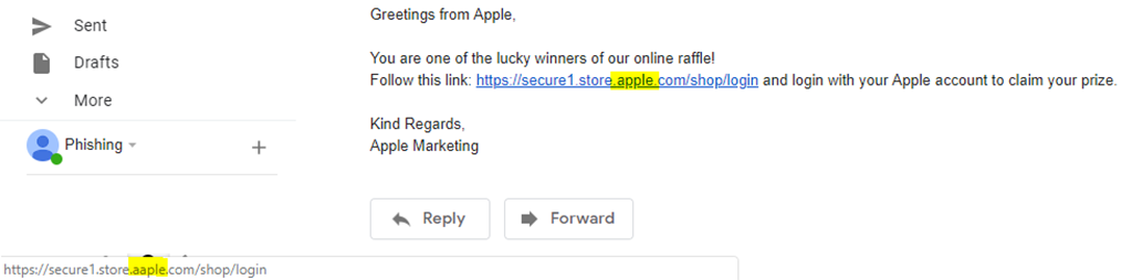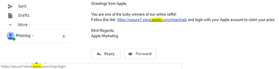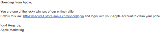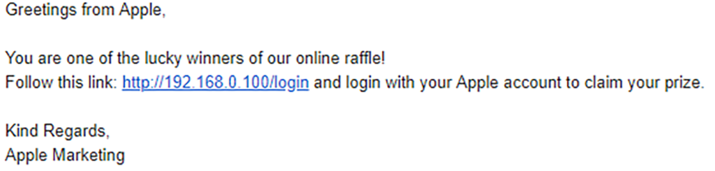 1. La nivelul doi, robotul va urmări structura linkului din e-mail și va da click doar dacă linkul este cel așteptat (de exemplu, dacă e-mailul de phishing pare că vine de la Apple, atunci robotul se așteaptă să "vadă" un link care duce la pagina de login Apple). Această verificare se face doar la nivel de text al linkului, ceea ce înseamnă că, pentru a trece mai departe, este suficient ca atacatorul să deghizeze linkul real. Exemplu de e-mail:
