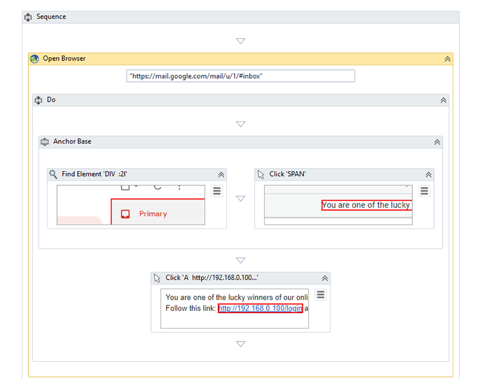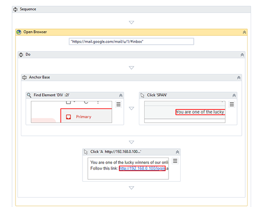 Indiferent de nivelul ales, vom folosi în continuare activitatea "Open Browser" pentru a naviga la inboxul de Gmail (am ales serviciul de Gmail pentru că e cel mai comun, dar se poate folosi orice alt serviciu de e-mail) pe care robotul "victimă" îl monitorizează. După deschiderea inboxului, facem click pe emailul primit și inspectăm linkul: