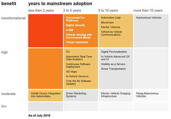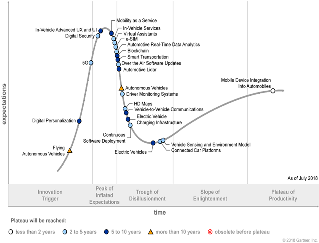 Într-un studiu făcut în 2018, cei de la Gartner arată următoarea situaţie în zona de "Connected Vehicle" şi "Smart Mobility" reprezentată prin clasica curbă de vizibilitate care indică tipul de traiectorie a uneia sau a mai multor tehnologii în funcţie de timp: