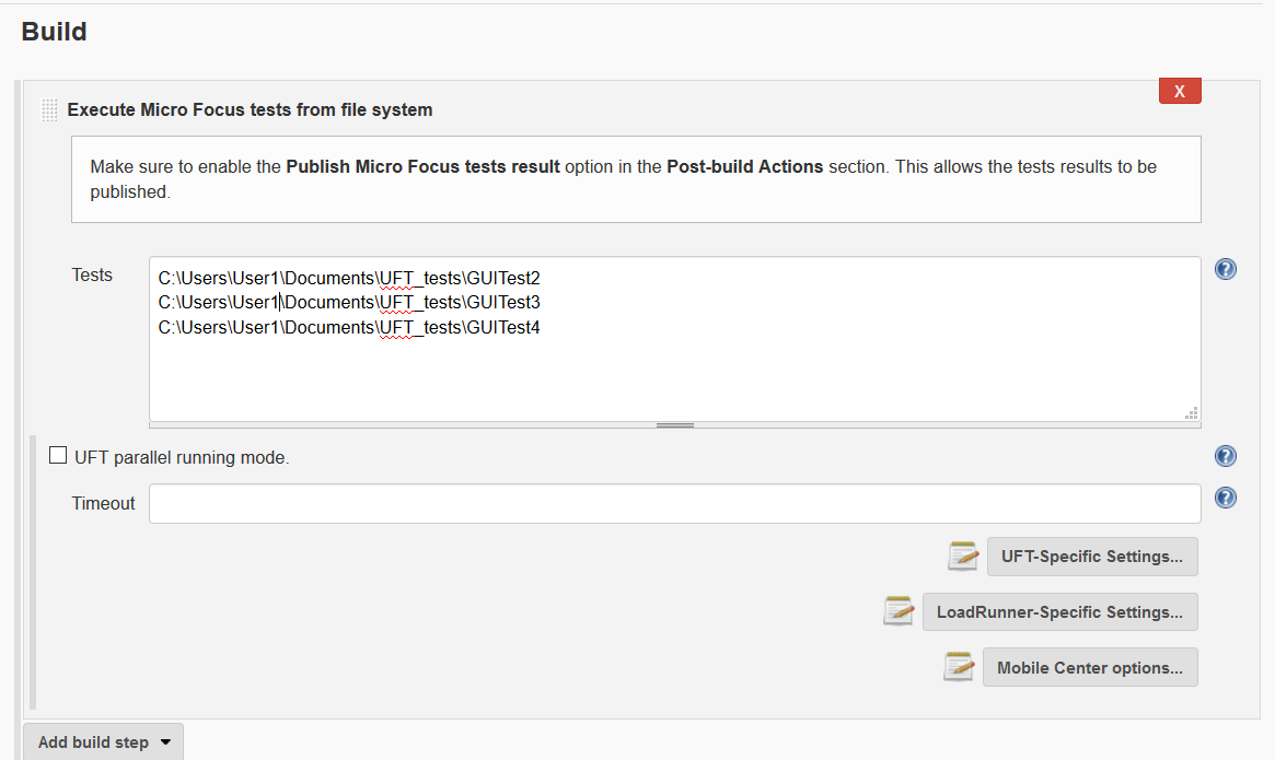 Când este configurat, fiecare test este executat secvențial. În timpul executării fiecărui test, environmenturile multiple sunt testate în paralel. Pentru aceasta opțiune se alege la build step ca tip de task "Execute Micro Focus tests from file system" și se selectează opțiunea "UFT parallel running mode". După aceasta, se definesc testele și environmenturile paralele.