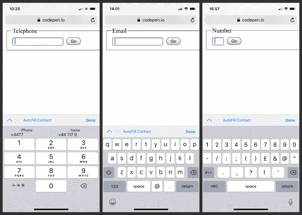 Deși urmările sunt mai puțin grave ca în scenariul anterior, dacă folosim elemente input generice și pentru aceste situații, vom forța utilizatorul să efectueze mai mulți pași pentru a căuta în tastatura virtuală diverse simboluri. Dacă însă folosim input de tipul telephone, email, url respectiv number, putem declanșa tastatura corespunzătoare fiecărui tip de date: