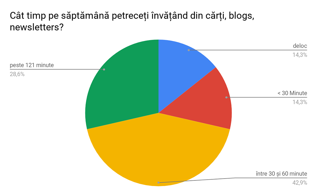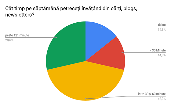 Interesant de observat este cum un procent mic de Scrum Masteri (sub 30%) investesc peste două ore în surse formale de învățare, cum ar fi cărți. Aceasta împreună cu faptul că aproape niciodată două implementări Scrum nu vor fi identice, retrogradează blogurile sau experiențele personale din alte industrii la un rol de resursă secundară de învățare. În Automotive, majoritatea dintre ei preferă să profite de pe urma experiențelor altor colegi, în cadrul comunităților noastre de practică.