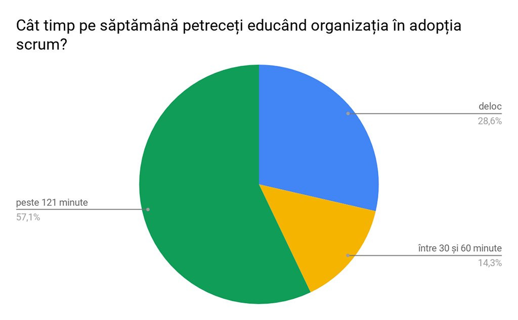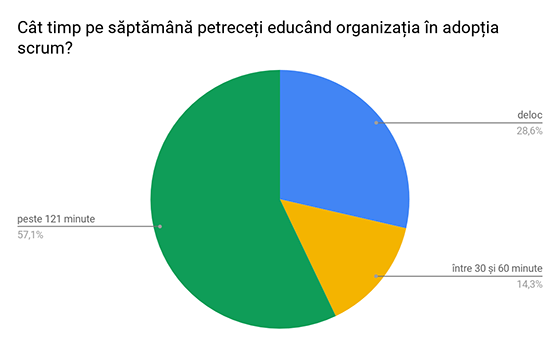 În final, majoritatea dintre colegii Scrum Masteri (aproape 60%) petrec un procent ridicat de timp în ajutarea organizației. Acest lucru este în principal atins prin participarea la comunitățile de practică unde iau parte atât Scrum Master cât și Product Owners, Business Consultants, Managers, Project Managers cât și prin participarea activă la programele de mentoring și dezvoltare personală și profesională din Automotive.