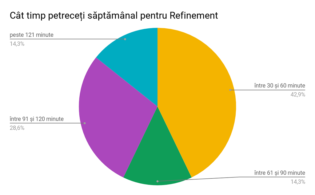 Dar ceea ce nu este deloc surprinzător este constituit și de faptul că toate echipele implementează într-un fel sau altul (peste 60% dintre ele investind mai mult de 60 minute săptămânal) sesiuni de Refinement o dată pe săptămână sau Sprint, chiar dacă ghidul Scrum nu menționează explicit cum această practică ar trebui implementată și în ciuda rezistenței intrinseci a colegilor din development de a participa la încă un meeting. Aceasta arată cum o practică chiar dacă nu este o parte formală a unui framework își poate câștiga acceptare din toate direcțiile, dacă aduce valoare adăugată chiar și într-un mediu nearshoring, unde timpul este o resursă extrem de prețioasă.