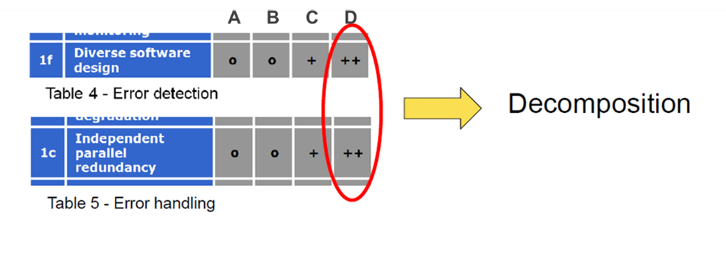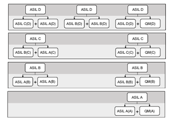 Mai sus am descris care sunt nivelele de safety aplicate sistemelor, dar în cazul când nivelul ASIL maxim nu poate fi asigurat direct în sistem, standardul ISO26262 permite așa numita decompoziție a lor după cum este prezentată în imaginea de mai jos. Cu cât sistemul este cotat cu un nivel de safety ridicat, cu atât costurile de implementare HW si SW cresc. Când este aplicată decompoziția, ne ajută să împărțim sistemul în elemente redundante cu un nivel de siguranță mai redus, ceea ce duce la îndeplinirea cerințelor sistemului fără a afecta prea mult costurile.