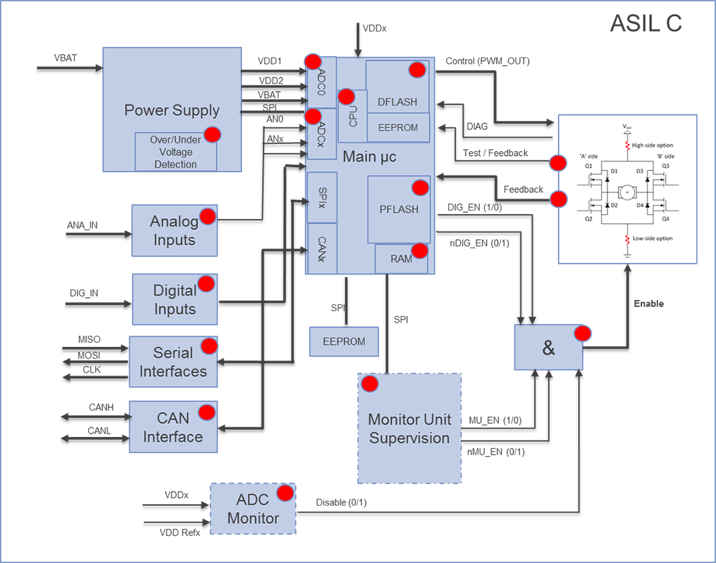 Închei acest articol prin a vă prezenta, mai jos, un exemplu de arhitectură ECU control electrovalve sau motoare electrice, cu aplicabilitate în zona de transmisie automată, suspensie controlată sau control direcție. Componentele marcate cu buline roșii reprezintă zonele safety din sistem care trebuie monitorizate și controlate de SW pentru a atinge nivelul ASIL cerut.