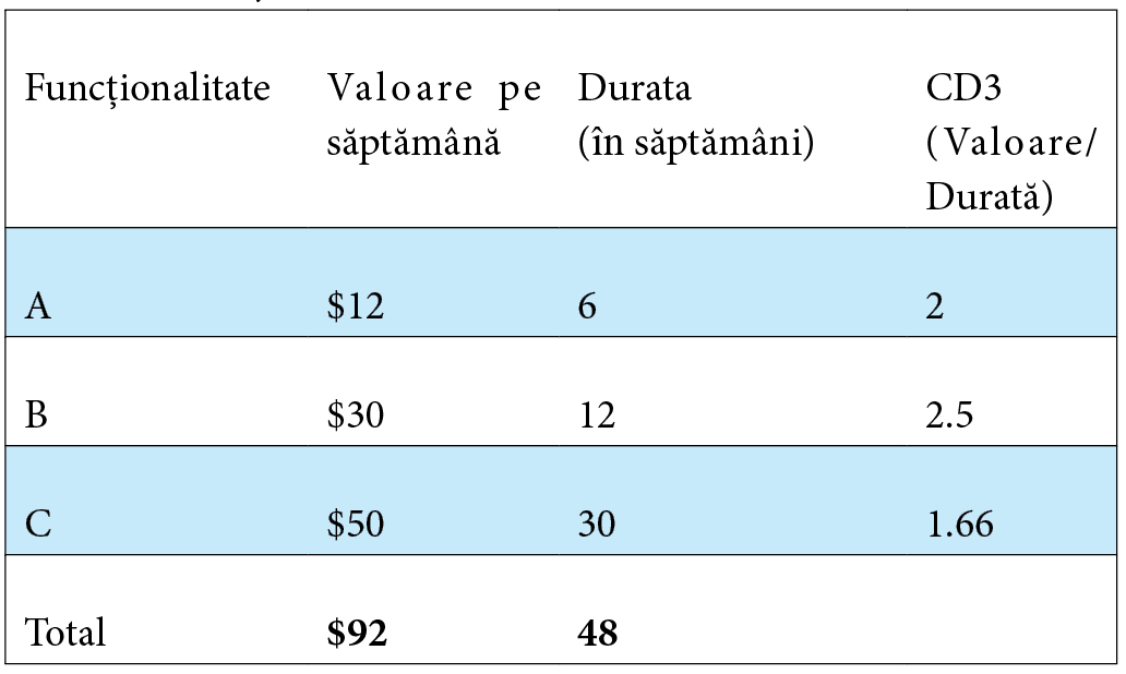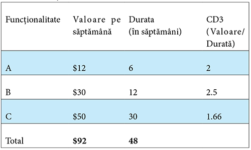Derek Huether descrie în detaliu diferite scenarii privind prioritizarea funcționalităților în [1] și arată că CD3 este cel mai eficient. Pentru exemplificare, să considerăm funcționalitățile din tabelul de mai jos: