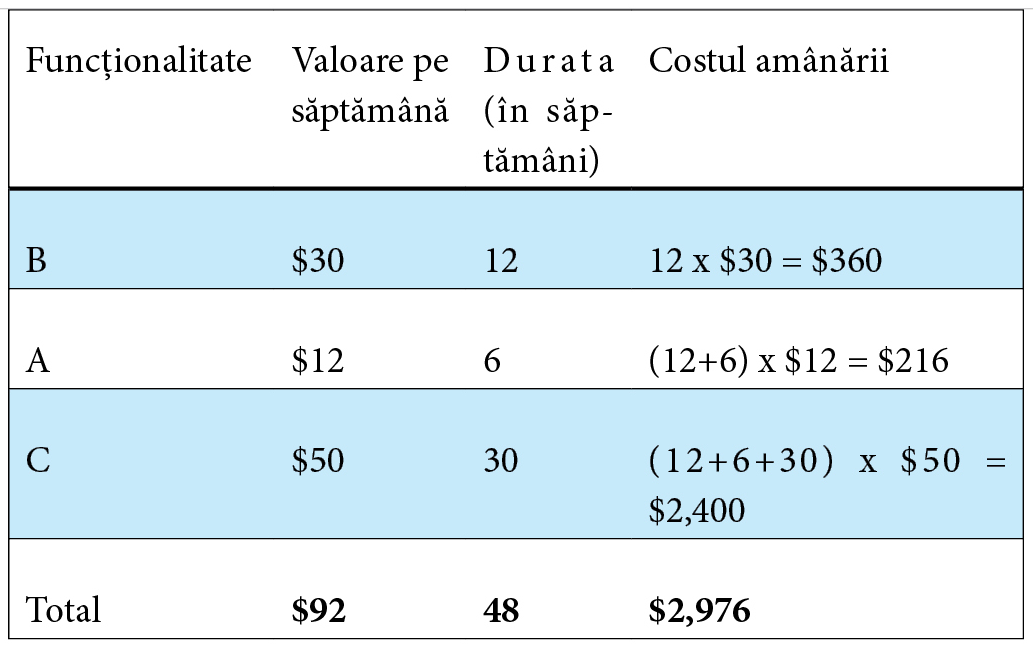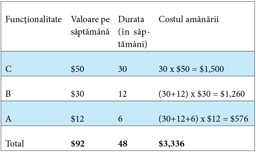 În cel de-al doilea scenariu, funcționalitățile sunt prioritizate exclusiv după valoarea furnizată, astfel încât acestea vor fi livrate în următoarea ordine: C, B, A. O funcționalitate va implica costul amânării până când aceasta și toate funcționalitățile cu valoare mai mare vor fi livrate. Costul total al amânării este de \$3,336, calculat după cum urmează: