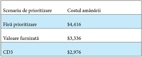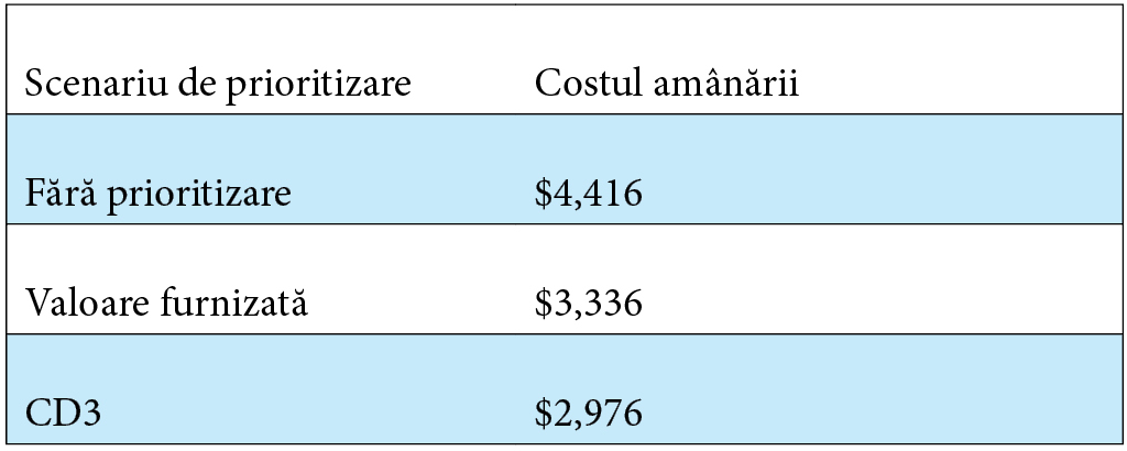 În cel de-al treilea și ultimul scenariu considerat în acest articol, prioritizarea se face folosind CD3. Ordinea în acest caz este B, A, C, iar costul total al amânării este de \$2,976: