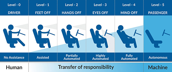 5 - Autonomie: autovehiculul efectuează toate sarcinile de conducere fără ca atenţia pasagerilor să fie necesară.