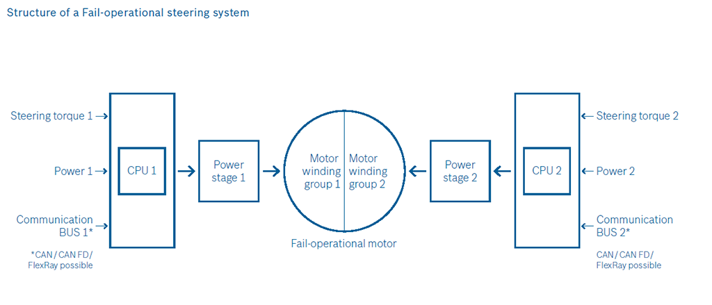 În epoca pre-automatizare, un control problematic al direcţiei și o lumină galbenă aprinsă în bord ar fi însemnat că şoferul trebuie să tragă pe dreapta și să aștepte să fie remorcat. În epoca vehiculelor autonome, o astfel de abordare ar contrazice cerințele privind siguranța și fiabilitatea maximă. Așteptările în creștere cer să fie pus în aplicare un nou sistem de direcție cu funcţionalitate fail-operational, care poate asigura direcția chiar și în cazul unei defecțiuni în sistem. Din moment ce siguranța completă este necesară de la bun început, Bosch a investit în crearea unui nou sistem care să învingă această provocare.