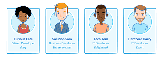 Hardcore Harry - Harry este un adevărat maestru al codului și este sceptic în ceea ce privește platformele de low-code, deoarece consideră că poate să scrie cod mai repede decât să manevreze prin drag and drop nivele ridicate de abstractizare. Harry a petrecut o mare parte din cariera sa folosind limbaje de programare precum Java, C#, Ruby sau PHP și este posibil să aibă experiență cu alte tooluri pentru dezvoltare rapidă de aplicații.