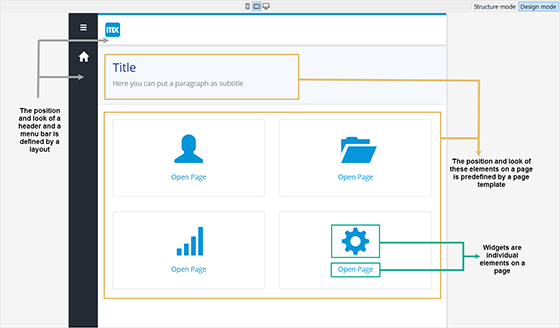 Fiecare pagină este bazată pe un layout și un template. Un layout este frame-ul în care se pune pagina, iar template-ul este o bază cu elemente predefinite (widgets).